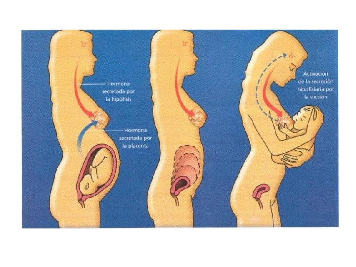 La lactancia La glándula mamaria se desarrolla desde la primera semana hasta después de dar a luz. La prolactina favorece la diferenciación de las células mamarias, antes del parto se inicia la producción de leche. Se estimula por la succión del pezón.