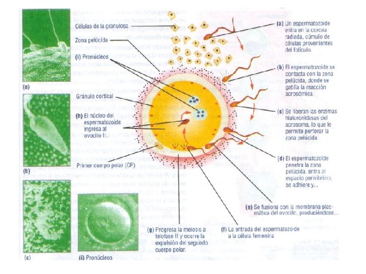 La fecundación Marca el inicia de una nueva vida. Corresponden a la unión del espermatozoide y del ovocito II. El ovocito II posee las células de la corona radiada (células de la pared del folículo), la zona pelúcida (glicoproteínas) y la membrana plasmática. Solo los espèrmatozooides capacitados (paso por el epidídimo y estadía en el tracto genital femenino), logran fecundar el ovocito II. Esto produce la reacción de la zona pelúcida, lo que impide la entrada de otros espermatozoides. Se completa la segunda división meiótica, se emite el segundo corpúsculo polar. La ovulación libera un ovocito II detenido en metafase II.
