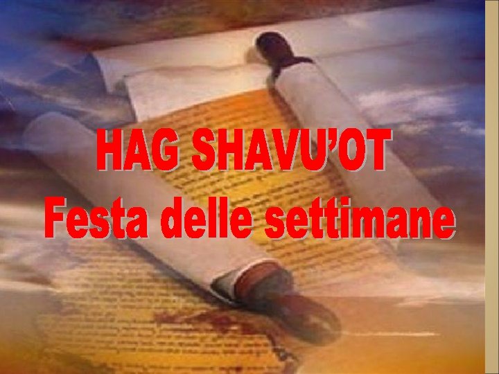LA FESTA DI SHAVU’OT O PENTECOSTE EBRAICA • Il calendario ebraico comprende le tre principali feste di origine biblica dette “del pellegrinaggio” o “feste del raccolto”: (Pesach=Pasqua; Shavuot=Pentecoste e Sukkot=Capanne) legate alle stagioni e ad antiche tradizioni agricolo-pastorali. • Shavu’ot è una festa agricola che si celebra nel periodo della mietitura, cinquanta giorni dopo la Pasqua. Di qui il nome, in greco, di Pentecoste. • Nella Bibbia è chiamata anche “festa della mietitura” 34, 22; Is 9, 2 o “giorno delle primizie” Nm 28, 26 Es 23, 16; Es