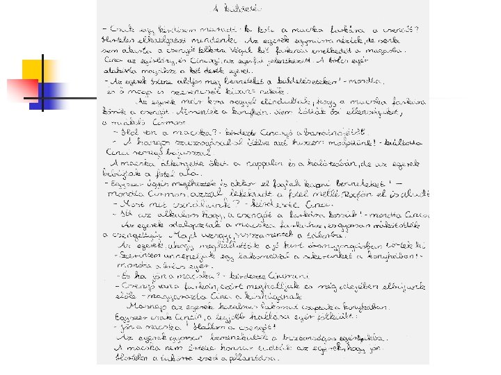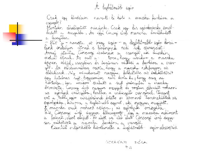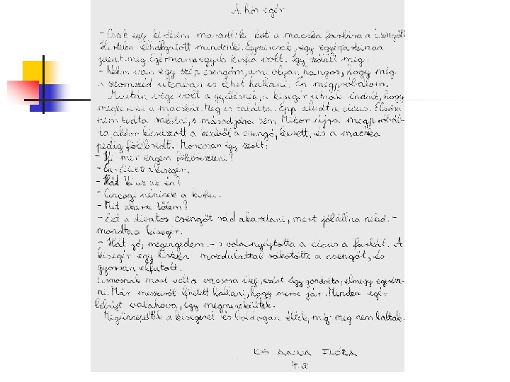 A mese elolvasása után a gyerekek azt a feladatot kapták, hogy írják le szerintük hogyan végződik a történet. Megkértük a francia partneriskola tanítóit is, hogy ők is dolgozzák fel hasonlóképpen a mesét. Tanulóink örömmel és érdeklődéssel hallgaták osztálytársaik és a francia gyerekek történeteit és szavazhattak a nekik legjobban tetsző mesebefejezésekre, amelyek a következő diákon olvashatóak. Mi is elküldtük e-mailben a mi meséinket angol fordításban és örömmel vettük, hogy ők is elolvashatták.