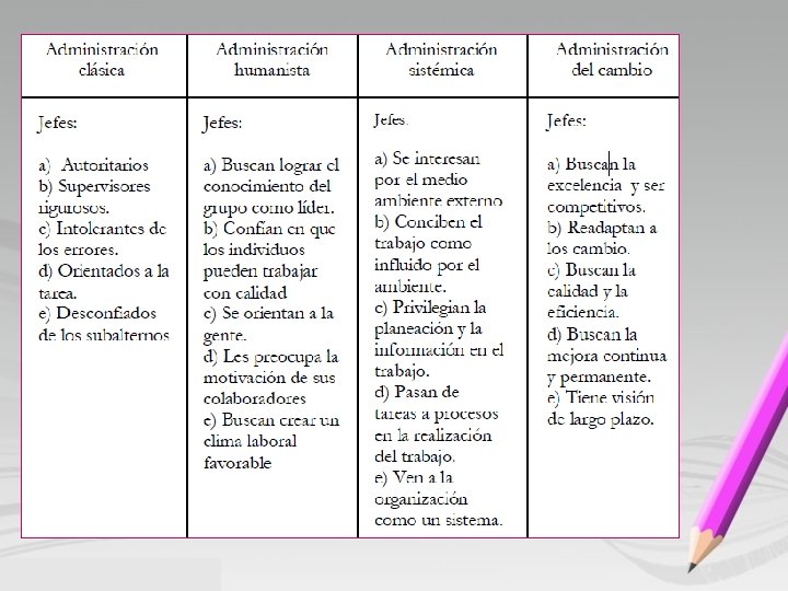 Para conseguir acercarse al perfil del administrador global, y aplicarlo a las funciones de director y supervisor de la escuela, es importante conocer las distintas etapas históricas de la administración. Estas etapas se dividen en clásica, humanista, sistémica y de cambio (excelencia, competitiva y globalización)