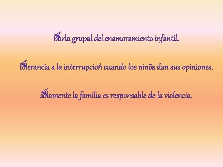• Desvalorizar o excluir a • Solicitar el apoyo en niñas que se les han tareas escolares con declarado a un niño. indicaciones como “díganle a su mama • Creación de que…” competencias entre ambos sexos. • Reafirmación de roles estereotipados. • Castigos mas severos a los niños que a las niñas.
