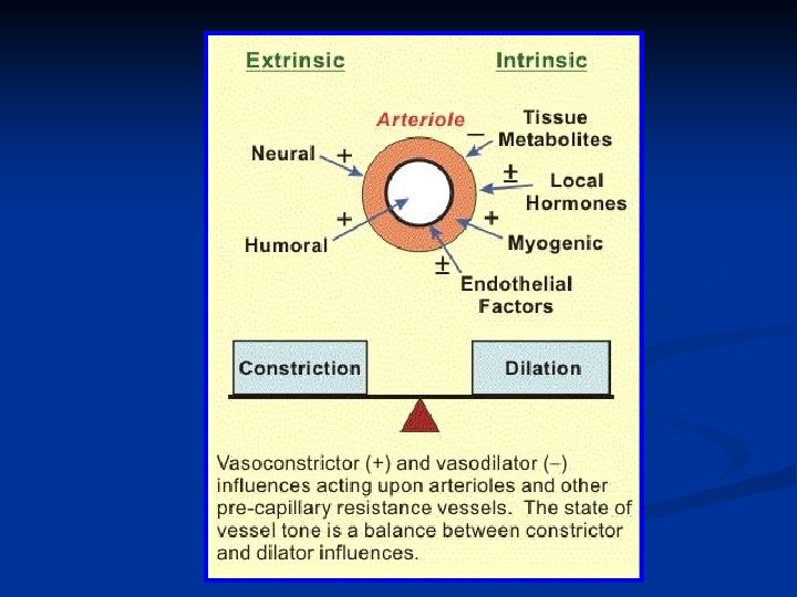 Infine possiamo dire che i fattori estrinseci (fattori che originano al di fuori dell’organo o del tessuto in cui il vaso è alloggiato) e i fattori intrinseci (fattori che originano dal vaso stesso o dal tessuto circostante) determinano il tono vascolare. Agiscono sia fattori vasocostrittori che fattori vasodilatanti.