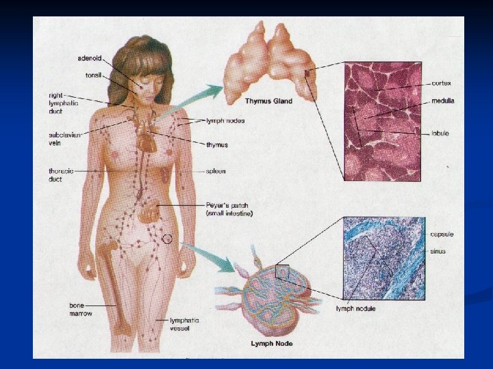 4. Linfonodi: aree ad alta concentrazione di linfociti e macrofagi distribuiti lungo i vasi linfatici; assenti nel SNC. Localizzazioni principali a livello cervicale, ascellare, inguinale, cavità pelvica, addominale e toracica. Sono zone ad alta diffusione per cancro e favoriscono il processo di metastatizzazione