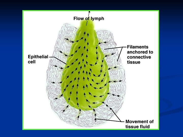 • endothelial cells overlap to allow fluid in, NOT out • interstitial fluid flows in when pressure increases in tissues