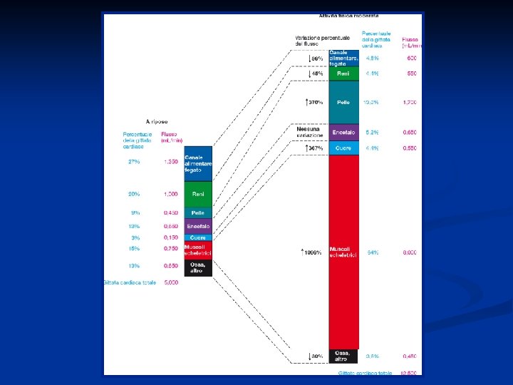 % ml/min per 100 gr Cervello 14 700 50 Cuore 4 200 70 Bronchi 2 100 25 Reni 22 1100 360 Fegato 27 1350 95 Muscolo inattivo 15 750 4 Osso 5 250 3 Pelle 6 300 3 Tiroide 1 50 160