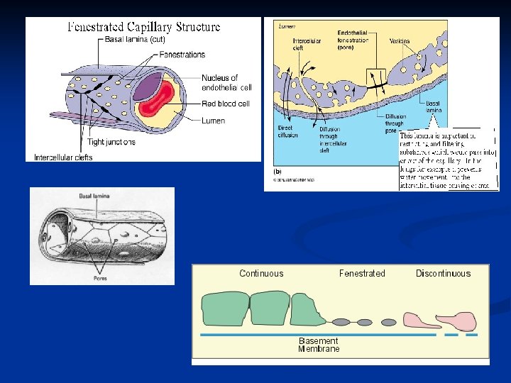 Continui o di primo tipo: si trovano nel muscolo, nella cute, nel SNC. Le cellule endoteliali sono molto vicine con stretti spazi fra le une e le altre. Bassa permeabilità. A livello di SNC ci sono giunzioni strette che sono responsabili della formazione della barriera ematoencefalica Fenestrati o di secondo tipo: in cellule esocrine, glomeruli renali, mucosa intestinale. Endotelio con perforazioni con una permeabilità relativamente alta. Discontinui o di terzo tipo: in fegato, milza, midollo osseo. Grossi spazi intercellulari con elevata permeabilità