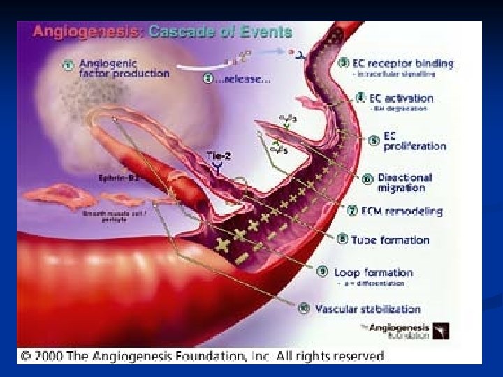 q The endothelial cells begin to proliferate, and migrate out through the pores of the existing vessel towards the tumour tissue, whilst specialized adhesion molecules, or ‘integrins’ help to pull the new blood vessel sprout forward. q Metalloproteinases are produced to disperse the tissue in front of the growing vessel, and as it extends, to remould it around the vessel.