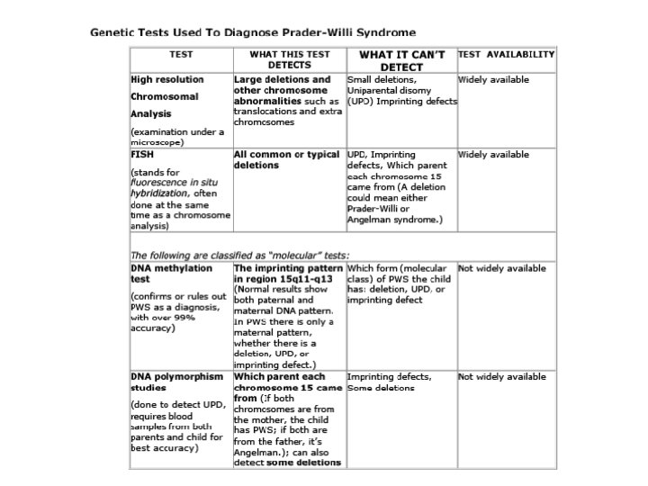 DIFETTI GENETICI NELLA SINDROME DI PRADER-WILLI In alcuni casi rari i geni della regione critica del cromosoma paterno sono di fatto presenti, ma non sono tuttavia funzionanti a causa di un problema al processo dell’imprinting. In questi casi è molto importante identificare con precisione il difetto genetico perché vi può essere un rischio elevato (50%) di avere altri figli affetti.