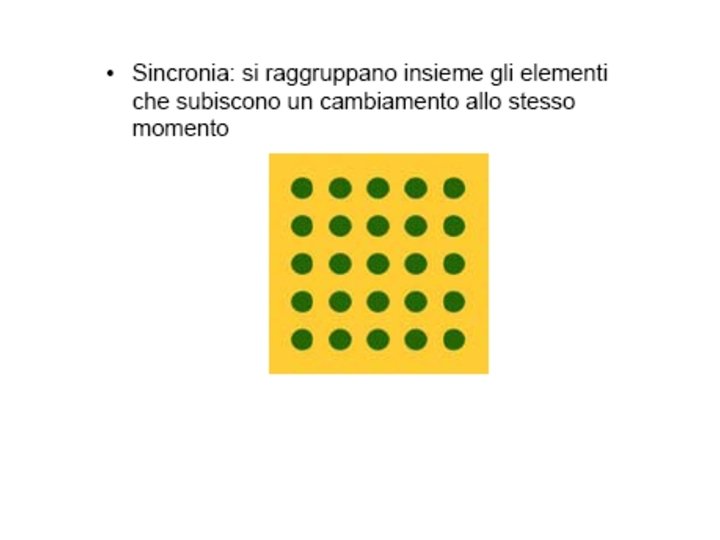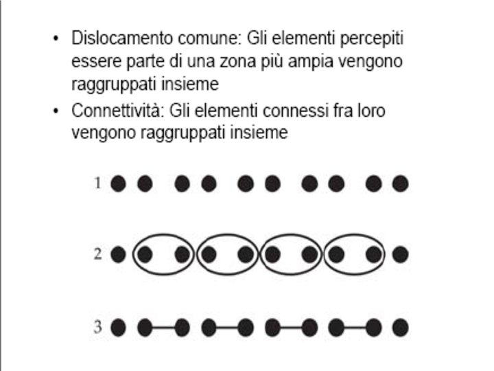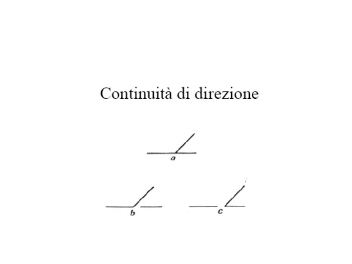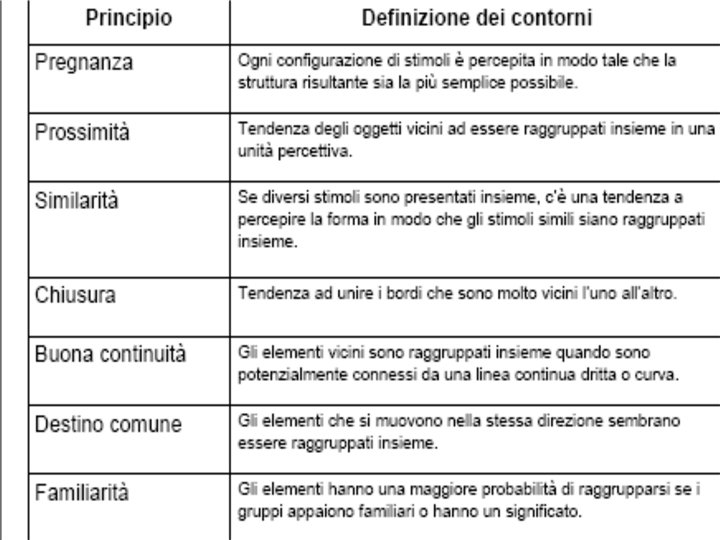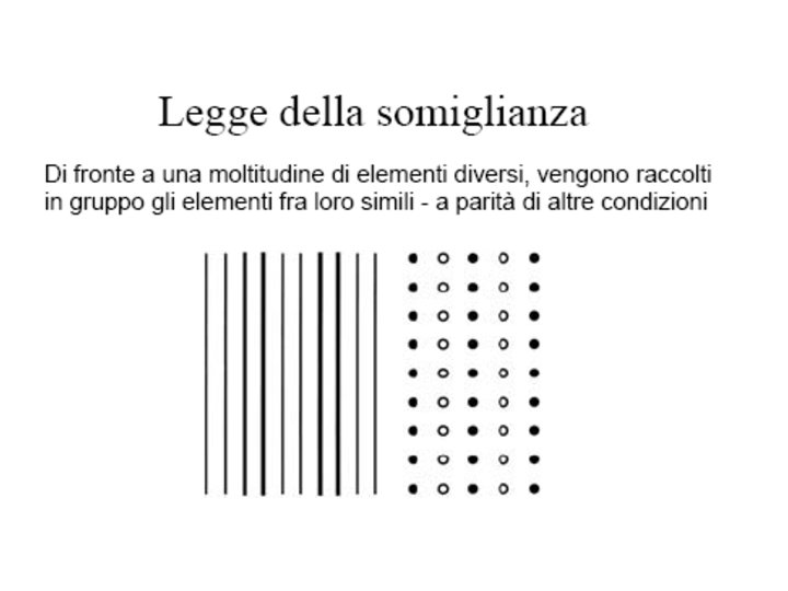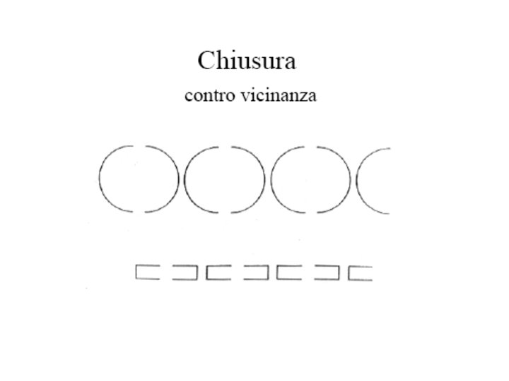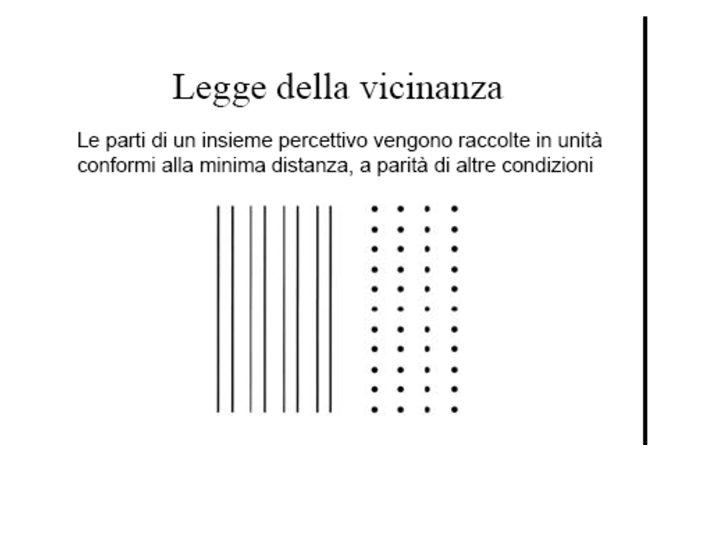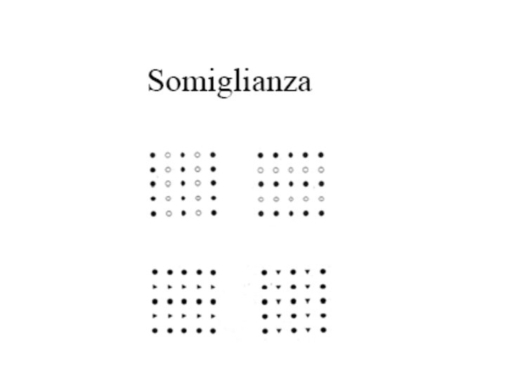 • Wertheimer ha individuato i seguenti fattori gestaltici del campo visivo che stabiliscono la dominanza percettiva di un’unica forma o struttura (o Gestalt): • • VICINANZA; SOMIGLIANZA; CHIUSURA; CONTINUITÀ; BUONA FORMA FATTORE EMPIRICO (ESPERIENZA PASSATA: l’azione di tale fattore non è però particolarmente intensa e si fa sentire solo quando non entra in competizione con altri fattori autoctoni).