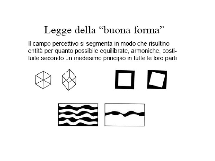Legge della pregnanza • La più importante delle leggi individuate da Wertheimer sul funzionamento delle Gestalt percettive è la legge della pregnanza: ciò che viene percepito contiene una forma organizzata che è la migliore possibile. • Pregnanza o bontà di una forma: una serie di caratteristiche rendono questa forma particolarmente armonica, simmetrica, semplice, ecc. • Le parti di un campo percettivo tendono a costruire le Gestalt più pregnanti possibili nelle condizioni date; vi sarebbe una tendenza spontanea verso la pregnanza.