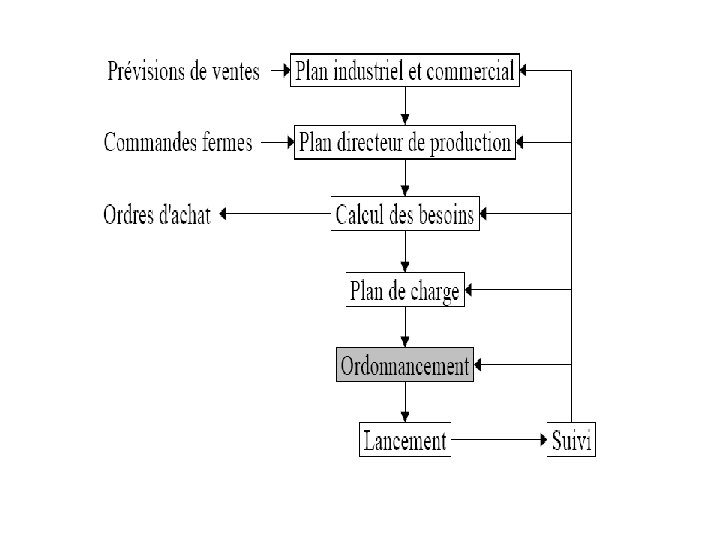 LE CALCUL DES BESOINS Propositions d'ordres de fabrication, d'achats, de sous-traitance Calcul détaillé des charges non Capacité disponible ? oui Ordonnancement Lancement effectif des ordres