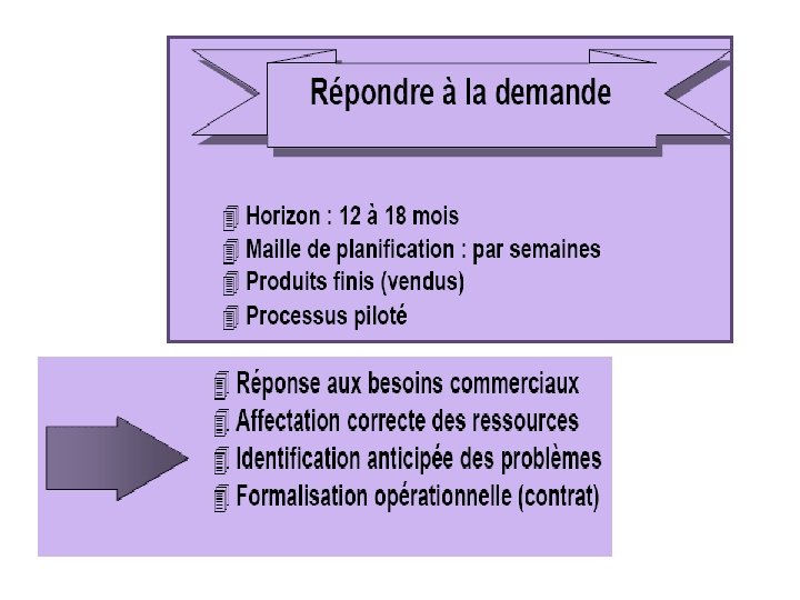 Objectifs de la planification de la production • Répartition des ressources de l’entreprise • Tenir compte de ses objectifs stratégiques • Tenir compte des contraintes existantes • Tenir compte de la demande prévue