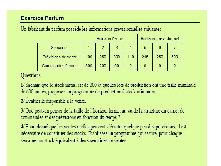 Stock initial: 50 Production par lot de 200 1 2 3 4 5 6 80 50 40 40 70 20 80 45 30 50 50 5 110 5 0 0 85 0 Stock prévisionnel 90 195 125 35 115 90 Production programmée 200 0 0 200 0 Semaine Prévisions Commandes fermes Besoins