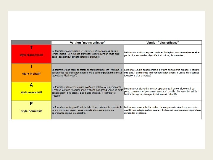 Les styles d’enseignement (Voir pp. 35, 36) �Style transmissif (Méthode frontale , magisrale ) �Style interrogatif (maieutique) �Style incitatif �Style guidé �Style permissif (à développer)