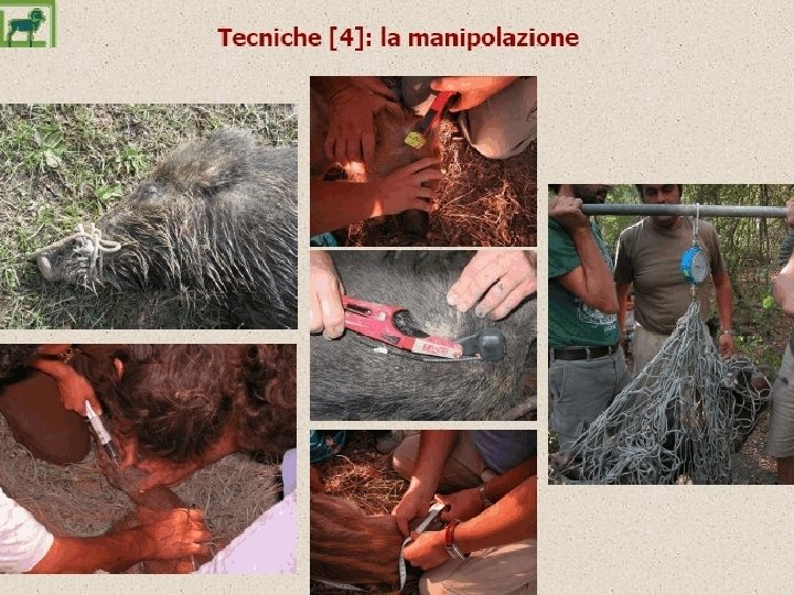 Riconoscimento degli incroci • Dimensioni corporee mediamente maggiori • Distribuzione della massa corporea Maschio adulto non puro: si notano il cranio “leggero” e la massa corporea distribuita in modo uniforme (evidente nel maschio) • Prolificità maggior numero di parti e/o di figli per parto • Forma della coda es. a “cavatappi” Le scrofe incrociate con le razze domestiche possono partorire anche 10 -12 piccoli • Colorazione del mantello caratteri che richiamano le razze domestiche (particolarmente evidenti nei soggetti di prima generazione) • Patrimonio cromosomico Cucciolata di “ibridi” di prima generazione