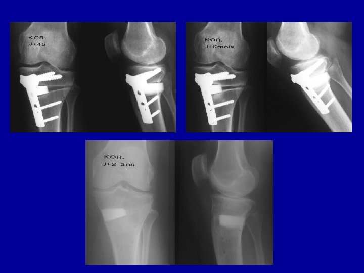 Gestes associés aux ostéotomies • Arthroscopies : 3 % • Arthrotomies : 28 % – – – Méniscectomies Transposition de la tubérosité tibiale Ostéophytes Greffes en mosaïque Ligamentoplasties du LCA
