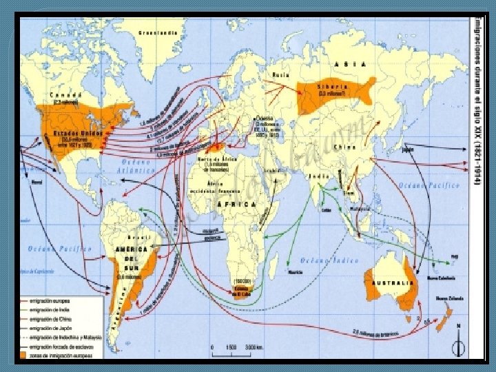 Principales desplazamientos Inmigraron 50 millones de personas a América entre 1846 -1924 EEUU acogió a 36 millones inmigrantes AL y Caribe fue hogar de 6 millones Fuentes: Thomas (1961: 9) y Muñoz (2015: 18)