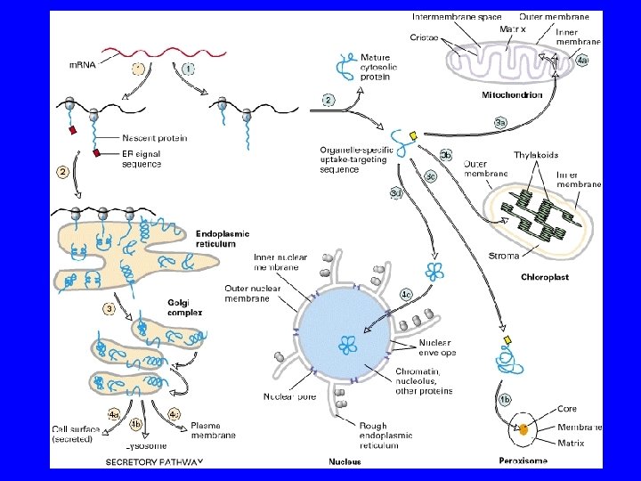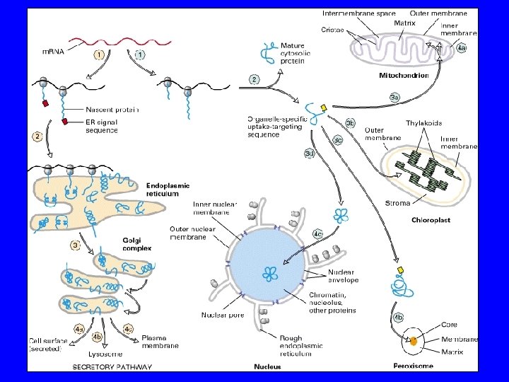 NEGLI EUCARIOTI LA SINTESI PROTEICA HA INIZIO SEMPRE NEL CITOSOL DNA m. RNA PROTEINE Problema n° 1: le proteine non possono attraversare liberamente la membrana n° 2: come fanno le proteine a conoscere il corretto sito di destinazione