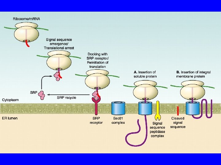 ER Segnale NH 2 Riconosciuto da SRP Sulla membrana di ER Recettore di SRP Recettore del ribosoma Sec 61/TRAM Sono chiusi se non c’è sintesi Riconosce SS Blocca la sintesi Riconosce ERR