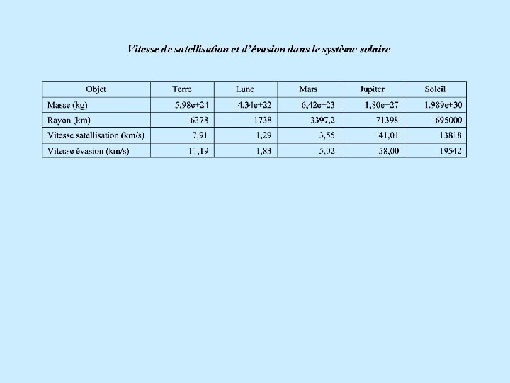 Gravité et satellites ! Vitesse de satellisation Au ras de la surface terrestre, orbite d’équilibre G = 6, 672 10 -11 m 3 kg-1 s-2 ; RT = 6378 km ; MT = 5, 98 1024 kg ! Vitesse d’évasion Pour qu’un objet s’échappe de l’attraction terrestre, il faut que sa vitesse (ou son énergie cinétique) au départ l’amène à l’infini avec une vitesse nulle