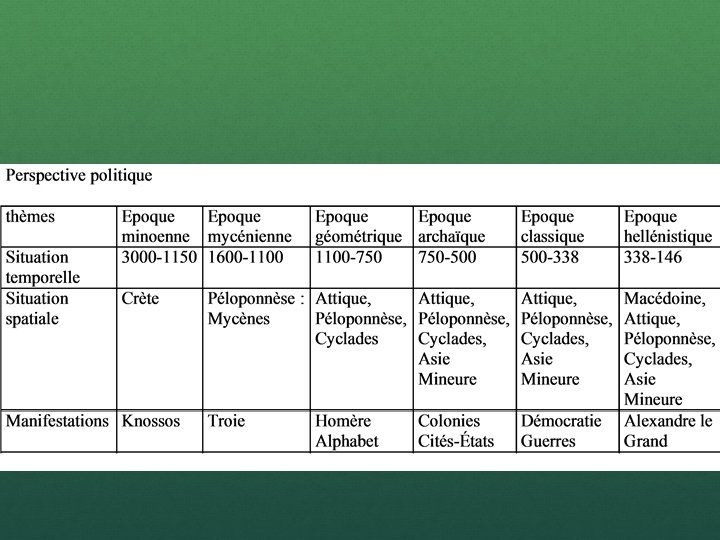 Histoire grecque Période minoenne Période mycénienne Période géométrique Période archaïque Période classique Période hellénistique 3000 -1150 av. J. C. 1600 -1100 av. J. C. 1100 -750 av. J. C. 750 -500 av. J. C. 500 -338 Av. J. C. 338 -146 av. J. C. Monarchie Tyrannie, Démocratie Monarchie