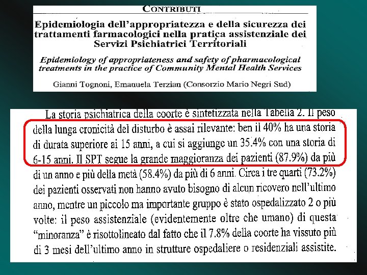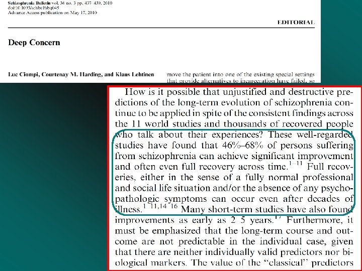 Anche molti anni dopo …. • Lo studio ISo. S ha però consentito di prendere in considerazione varie forme di disturbo schizofrenico, a partire dalla modalità di esordio (acuto o insidioso), da quella di decorso (episodico o continuo) e dall’esito (favorevole o sfavorevole): • questa suddivisione ha consentito di mettere in evidenza quello che gli autori hanno definito come guarigione tardiva (late recovery effect): • “… al quindicesimo anno di follow-up abbiamo osservato, nella coorte dei nuovi casi, una percentuale del 16% di esito favorevole dopo un decorso a disabilità costante. Anche se tale sviluppo positivo è meno frequente che in altri studi, questi dati spingono a sostenere l’ottimismo terapeutico e la riproposizione di interventi riabilitativi e di inserimento lavorativo nonostante i fallimenti nelle fasi precedenti del decorso …” (Harrison, 2001).