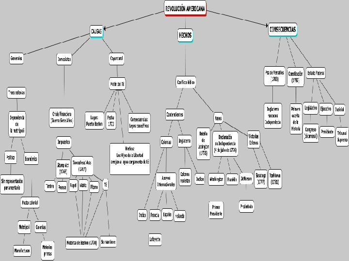 Consecuencias - Sociedad: algunos estados mantuvieron la sistema estamental, mientras en otros la burguesía se hizo con el poder. - Economía: desaparecieron las trabas económicas de la metrópoli e iniciaron un crecimiento económico y territorial (expansión hacia el oeste). - Política: se crea un estado basado en la división de poderes de Montesquieu. España, que había ayudado a los rebeldes, verá surgir movimientos revolucionarios en sus colonias americanas. Por su parte, Francia, vería estallar la revolución en 1789.