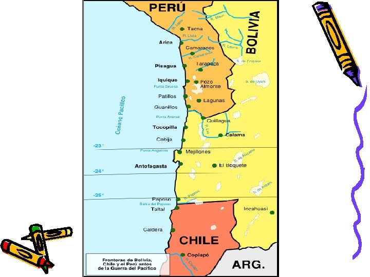 El Tratado de 1874 entre Chile y Bolivia • Se confirmó el límite en el paralelo 24º lat. sur. • Se suprimió la zona en que se compartían las ganancias aduaneras. • Bolivia se comprometía a no subir los impuestos a las empresas chilenas ubicadas al norte del paralelo 24º lat. Sur.