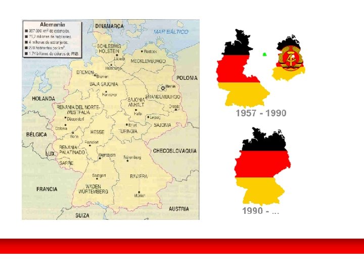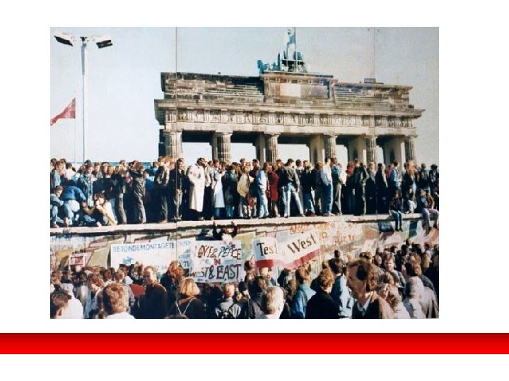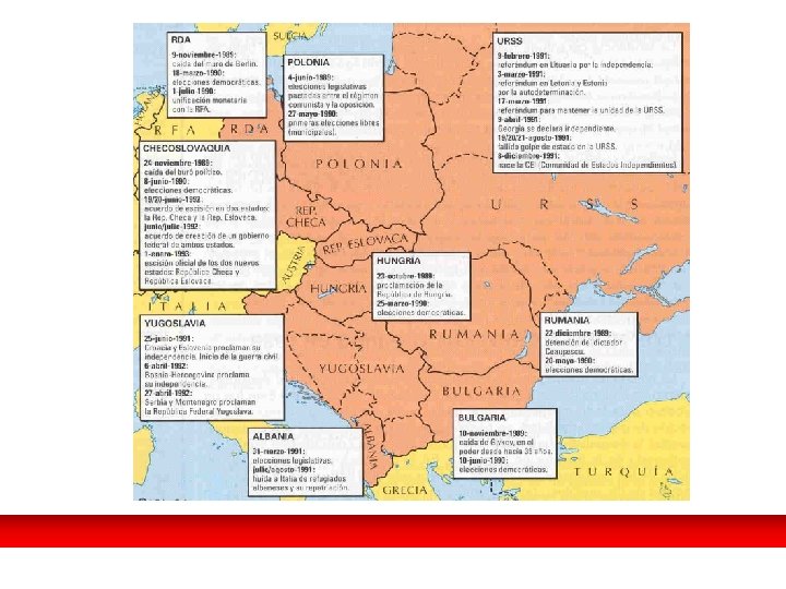 El fin de la Guerra Fría. SE ELIMINAN LAS SECUELAS DE LA GF. • Transformación de la OTAN y disolución Pacto de Varsovia (1 -IV-91). • En 1990 el Ejército Rojo se retira de Checoslovaquia y otros países, se archivaba la doctrina Breznev. • Reunificación alemana, Köhl, canciller de la RFA, tiene que vencer los recelos de los “aliados” y reconocer las fronteras de la II GM. (3 -X-90). • Firma del tratado de paz que pone fin a la II GM (12 -IX-90). El canciller Helmut Köhl ante las multitudes en el momento de proclamarse la reunificación de Alemania, era un 3 de octubre de 1990.