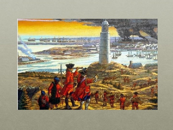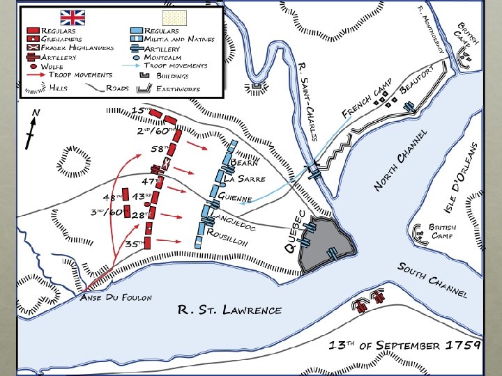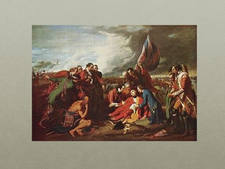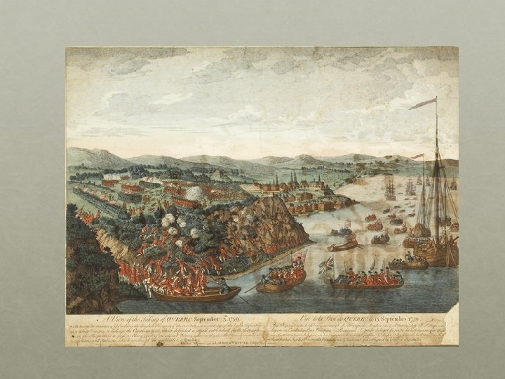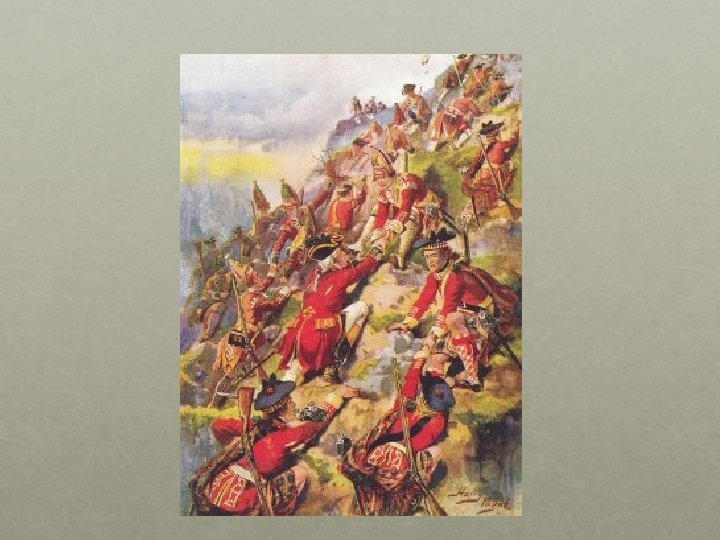 LA capture de quebec -Québec était le centre de la puissance française en Amérique du Nord. - En 1759, sous le commandement du général Wolfe, les Anglais lancent 9000 hommes contre Québec. - Les bombardements durent tout l’ été. - A cinq heures le débarquement a lieu. Wolfe supervise l’opération en personne. Montcalm arrive a Québec vers sept heures vingt seulement- pour constater que les Anglais sont maintenant sur les Plaines d’Abraham. - Montcalm a réuni 4500 hommes. Ils ont surtout l’habitude de se battre dans les forets- pas sur les champs de bataille. -- A dix heures vingt quatre, Wolfe s’ écroule, atteint mortellement a la poitrine. Il meurt le lendemain. - Wolfe meurt sur le champ de bataille. - La bataille des plaines d’Abraham a durée environ 30 minutes. - Le 18 septembre, 15 000 habitants deviennent sujets du roi d’Angleterre.