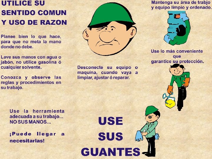* ASEGURE : Que haya suficiente espacio para sus manos y sus dedos. * LOCALICE : Guardas y protectores de maquinas, cerciórese que estén colocadas. * CUIDESE : De engranes peligrosos, que puedan machucar, cortar, ó amputar. * QUITESE : Anillos, reloj, o colguijos que puedan atorarse en las partes móviles. * VERIFIQUE : Las instrucciones de uso de maquinaria y equipo.