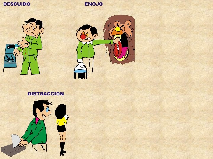 El tratamiento oportuno de una lesión menor, evita que se convierta en una lesión mayor. CORTADURAS Y RASPONES Una herida superficial se deja sangrar un poco, es una forma natural de limpieza, séquese y véndese. Una hemorragia más seria, puede detenerse aplicando un trapo limpio y haciendo presión sobre la herida. QUEMADURAS MENORES Empape el área quemada con agua fría. No aplique grasa ó ungüentos, si la piel esta destruida, cúbrala con grasa estéril (acuda al Servicio Médico). LUXACIONES Aplique compresas de agua fría, para aliviar el dolor. Consulte a un médico por si esta roto o astillado el hueso. QUIMICOS EN LA PIEL Enjuague abundantemente durante cinco minutos con agua corriente. Si aparecen excoriaciones y cuarteaduras consulte a su médico HUESOS ROTOS Aplique tablillas y vendas. Traslade al servicio Médico u Hospital inmediatamente. NO SE ARRIESGUE Cualquier lesión por pequeña que parezca. . . Repórtela al Servicio Médico de su empresa.