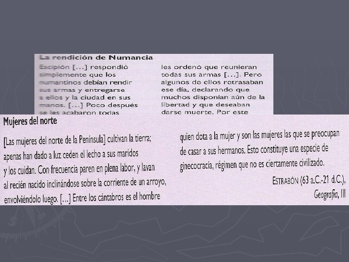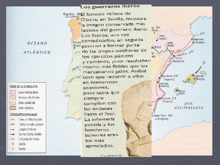 ► Conquista de la meseta y el norte peninsular. La estrategia de los pueblos prerromanos se basó en una guerra de guerrillas guerra lusitana (hasta el asesinato de Viriato) y guerras celtibéricas (asedio de Numancia). Los pueblos de las montañas del norte (cántabros, astures, vacceos, galaicos…) se unieron para luchar contra los romanos.