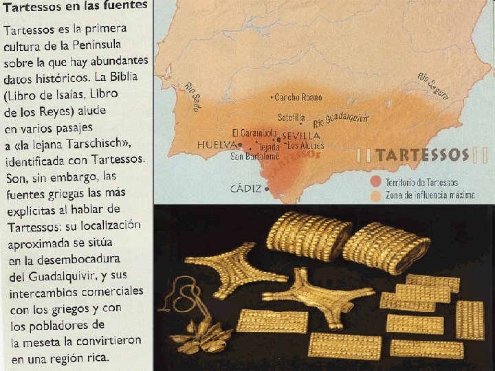 TARTESSOS ► Las fuentes griegas y los hallazgos revelan que Tartessos fue un gran reino cuya influencia se extendía desde Sierra Morena hasta Gibraltar y desde el Atlántico hasta Cartagena. Su economía se basaba en la agricultura y una ganadería muy avanzadas, explotaban permanente los yacimientos de plata, cobre y plomo, y, a través de arriesgadas expediciones marítimas por el Atlántico, obtenían el estaño de las islas Casitéritas (islas Británicas). Mas tarde, Tartessos cayo bajo dominio cartaginés.