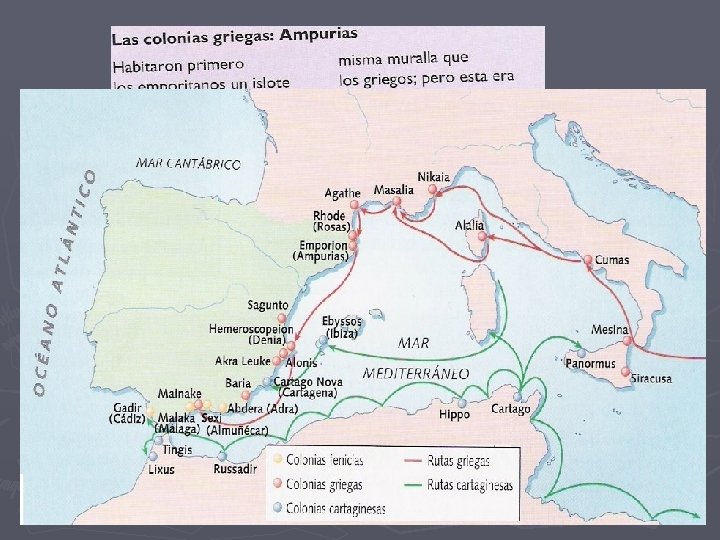 COLONIZACION GRIEGA ► A partir del año 600 a. C los griegos empezaron a llegar a las costas mediterráneas peninsulares. Por la búsqueda del comercio de los metales, el esparto y la sal. La colonización estuvo dirigida por los focenses (Focea, ciudad-Estado griega). Su principal fundación fue Emporion (Ampurias), que significa “almacén o mercado”, en la costa de Girona. Esta alcanzó su mayor importancia cuando los griegos, derrotados por Cartago en la batalla de Alalia (535 a. C) perdieron el dominio naval en el sur del Mediterráneo. Colonos de Emporion fundaron más tarde Rosas y Pyrene.