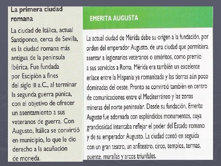Emérita Augusta La ciudad fue fundada en el 25 a. c. con el nombre de Emerita Augusta por Octavio Augusto y sus legiones licenciadas. Estas legiones se ubicaron en el poblado prerromano ya existente a cambio de darles la categoría de ciudadanos romanos a los antiguos pobladores. La ciudad fue la capital de la provincia romana de Lusitania. El término emeritus significaba en latín "retirado" y se refería a los soldados jubilados con honor. ► Durante siglos y hasta la caída del Imperio Romano de Occidente, Emérita Augusta fue un importantísimo centro jurídico, económico, militar, cultural. ►