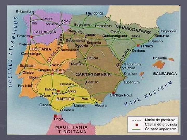 SIGLO III ► Dividida en seis (más tarde siete) provincias (una de ellas en el norte de África) Tarraconense Carthaginense Baetica Lusitania Gallaecia Balearica Mauretania Tingitana