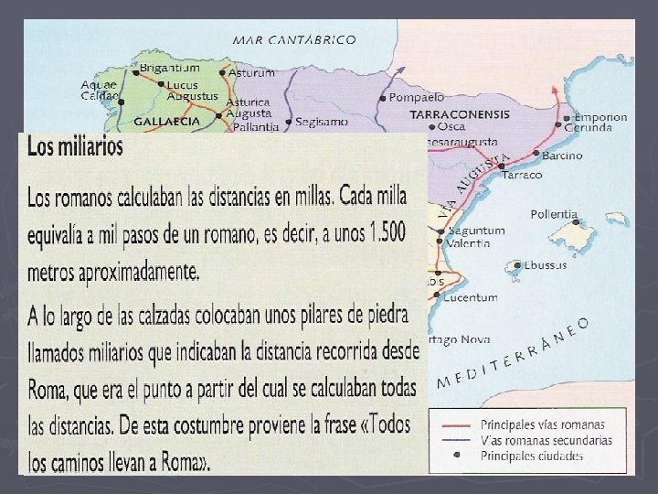 RED DE COMUNICACIONES ► Mejoraron las rutas existentes (las pavimentaron e hicieron aptas para carretas y construyeron puentes). Empalmaron con las de la Galia, constituyó la estructura básica de la comunicación (comercio, militares y administrativos). ► Itinerarios fundamentales: Vía Augusta (costa mediterránea) Vía de la Plata (Astorga hasta Sevilla) Vía de Astorga a Burdeos.