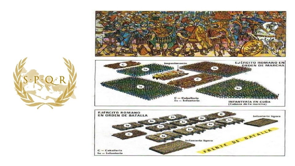 EJÉRCITO El ejército estaba compuesto por: -Cónsul -Tribuno militar -Centurión -Optio -Signifer -Aquilifer -Cornicen -Tubicen -Sagittarius -Velites -Eques -Legionario