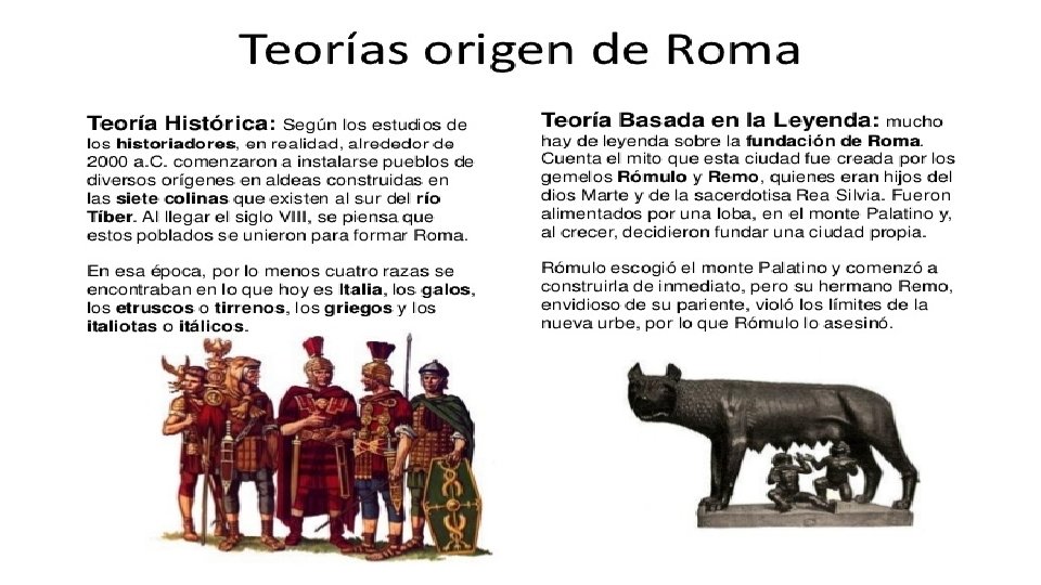 Orígenes de roma Destacan dos orígenes: La Leyenda de Rómulo y Remo, y la realidad histórica.