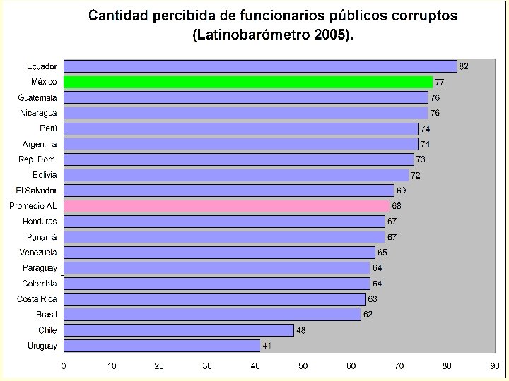 1. En México permanece una percepción alta de corrupción y uso electoral de los programas sociales. • 77% mexicanos percibe que existen funcionarios públicos corruptos. • 35% conoce personalmente alguien que recibe privilegios por ser simpatizante del partido de gobierno. • (fuente: Latinobarómetro, 2006).