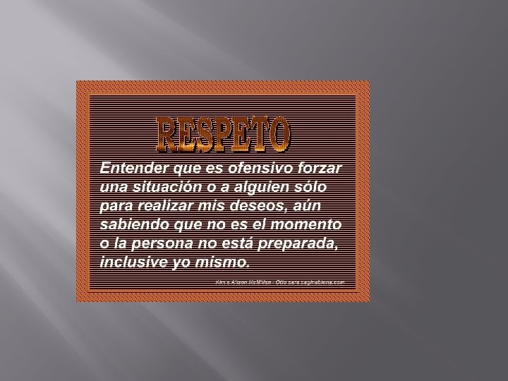 ¿Que es el respeto? El respeto o reconocimiento es la consideración de que alguien o incluso algo tiene un valor por sí mismo y se establece como reciprocidad: respeto mutuo, reconocimiento mutuo. El término se refiere a cuestiones morales y éticas, es utilizado en filosofía política y otras ciencias sociales como la antropología, la sociología y la psicología. El respeto en las relaciones interpersonales comienza en el individuo, en el reconocimiento del mismo como entidad única que necesita que se comprenda al otro. Consiste en saber valorar los intereses y necesidades de otro individuo en una reunión.