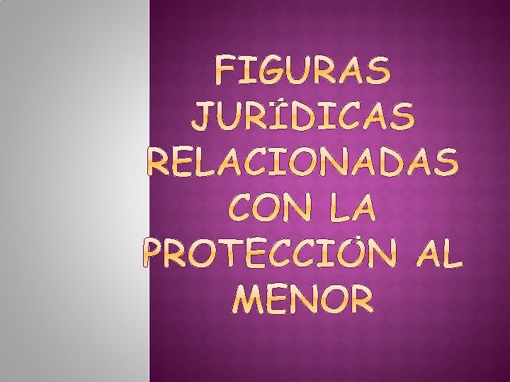 • • PATRIA POTESTAD: es la obligación que tienen los padres de dotar de protección y asistencia a sus hijos mientras sean menores. EMANCIPADO: es cuando el joven se desprende de la patria potestad, esta se produce con la mayoría de edad o por matrimonio, decisión judicial o concesión paterna. TUTELA: poder otorgado por la ley que tiene como objetivo la protección y defensa de los menores de edad, huérfanos, incapacitados… GUARDA: situación temporal de acogimiento de un menor desamparado y la ejercen las personas que forman la familia o el director del centro residencial. ACOGIMIENTO FAMILIAR: su finalidad es integrar al menor en una vida familiar que complemente temporalmente a la suya natural. ADOPCIÓN: figura jurídica que por decisión judicial produce entre adoptantes y adoptados un vínculo de filiación. DESAMPARO: se produce a causa del incumplimiento, imposible o inadecuado ejercicio de los deberes de protección establecidos para la guarda de los menores.