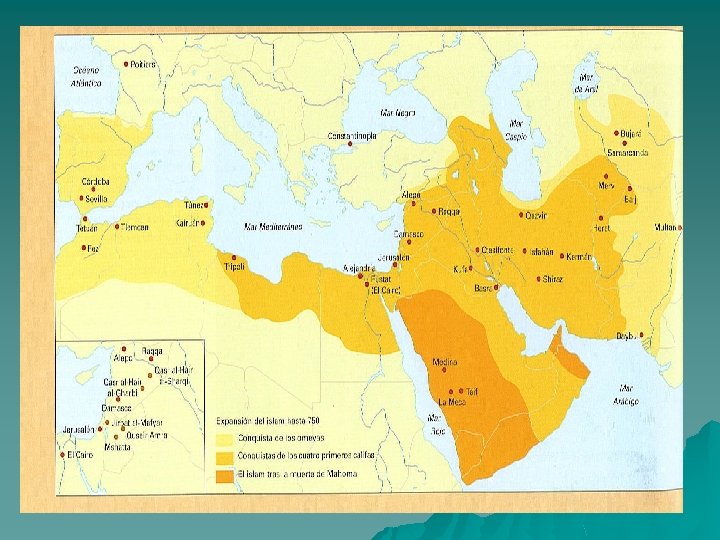 Los muladíes u A partir del siglo VIII, hispanorromanos y visigodos se convierten al Islam, y son denominados muladíes (del término muwallad "converso"), si son descendientes de matrimonios mixtos, y musálima, si se han convertido por propia convicción. u Constituyeron la mayoría población de al-Andalus. de la