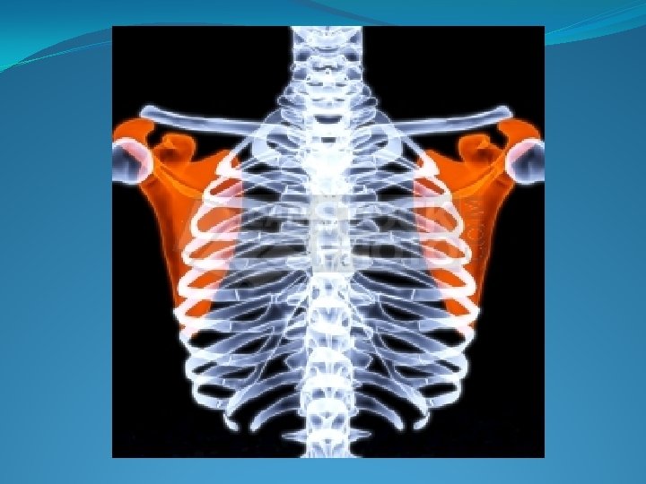 PUNTOS DE REFERENCIA � Limite inferior del torax(diafragma, desde xifoides 7 mo siguiendo la arcada costal hasta 12 vo arco posterior ). Anterior, ángulo de LOUIS. 2 do cartílago costal, aquí la primera costilla que se palpa es la SEGUNDA. � Posterior, el borde superior de la escapula corresponde a la 2 da costilla y la punta de escapula corresponde a la 7 ma costilla. � La séptima vertebra cervical marca el limite entre cuello y tórax. � Posterior y al centro la línea vertebral ( hemitórax ).