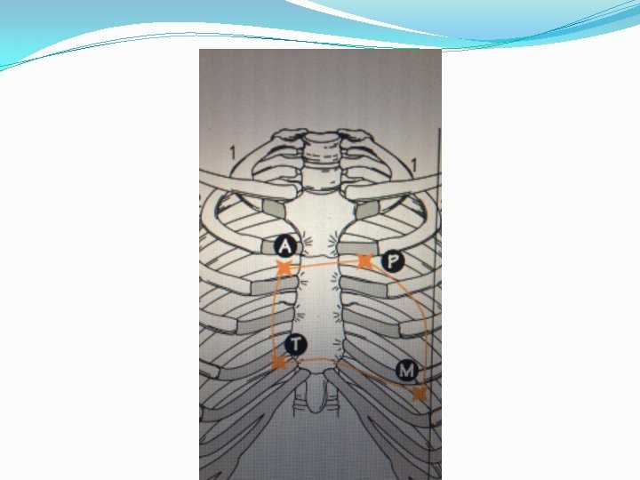 AUSCULTACION ANTERIOR �Huécos supraclaviculares. �Angulos de LOUIS, en segundo espacio intercostales. (fócos aórtico y púlmomar). � 4 t 0 y 5 t 0 espacios intercostales izquiérdos, en fócos mitral y tricuspídeo.