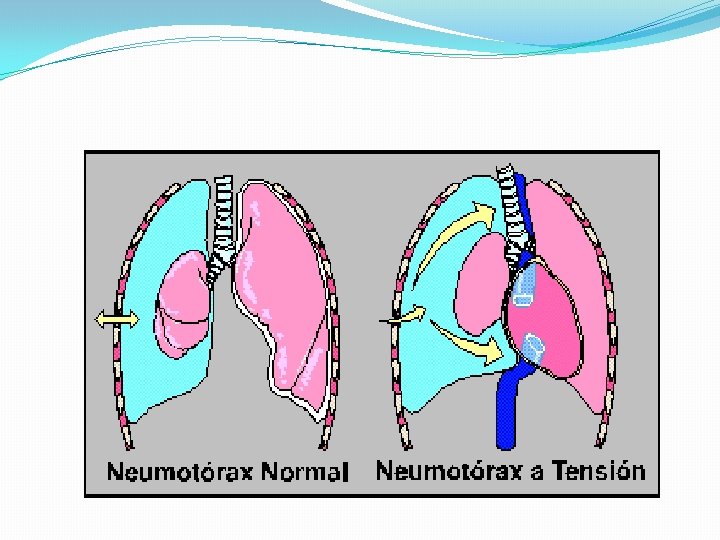 Neumotórax a tensión � El aire entra y no sale, diferente al neumotórax compensado donde las presiones se igualan, el paciente tiene dificultad por el cuadro agudo pero no debe morir, en neumotórax a tensión se muere por colapso total.
