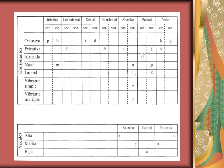 24 fonemas 19 consonánticos, 5 vocálicos. Las características que distinguen a los sonidos consonánticos son:
