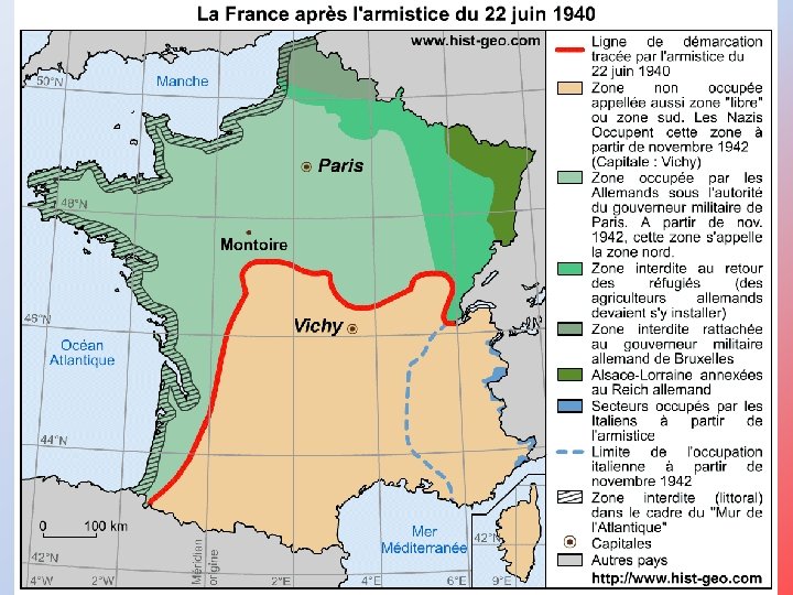 Le découpage de la France après l'armistice du 22 juin 1940 Dès le 25 juin 1940, la ligne de démarcation coupe la France en deux grandes zones principales : La zone occupée (ou "la zone nord") Occupée par les Allemands, cette zone est placée sous l'autorité du gouverneur militaire de Paris et couvre environ 55% du territoire. Elle est rebaptisée la zone nord, en novembre 1942, date à laquelle les Allemands occupent également la zone libre. La zone libre (ou "la zone sud") Le 2 juillet 1940, le gouvernement français s'installe à Vichy qui devient en quelque sorte la "capitale" de la zone libre, familièrement appelée "zone nono" (pour non occupée). Le 10 juillet 1940, le Parlement vote les pleins pouvoirs au maréchal Pétain qui promulgue "l'Etat français" et s'engage peu après dans une politique de collaboration avec l'occupant nazi. En novembre 1942, la zone libre est rebaptisée la "zone sud", lors de son invasion par les Allemands.